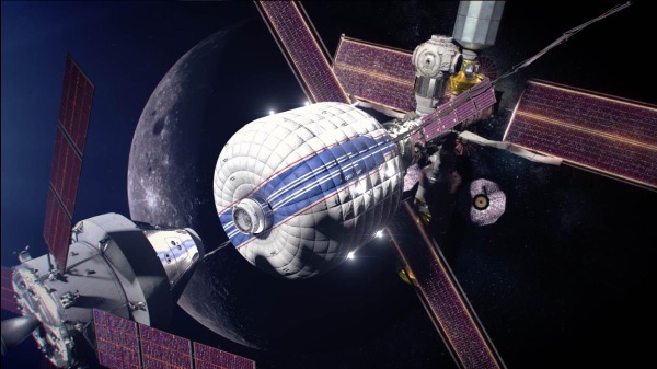 A visualization of Gateway with its proposed large-volume deep space habitation (and an arriving Orion capsule). Image credit: NASA report |  |