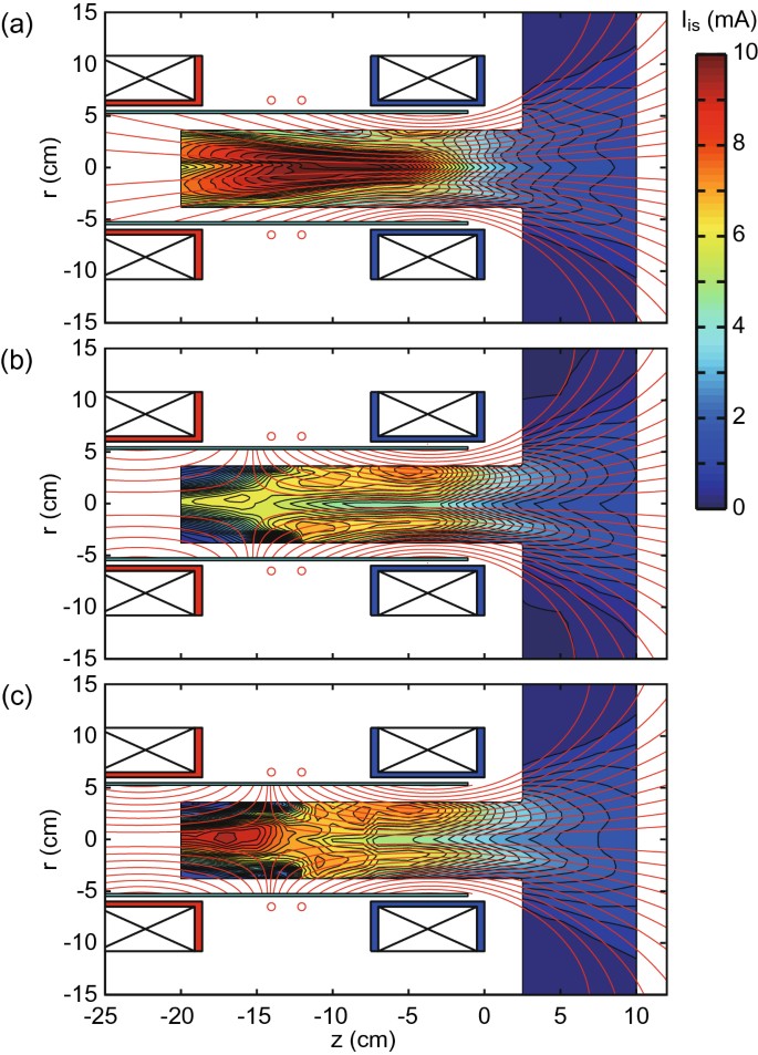 | The prototype Magnetic Nozzle (red lines) directing ions out the “downstream” end of the plasma vessel (to the right) without cusp fields can be seen in (a). The addition of (b) -10 and (c) -15 amp cusp fields show the isolation of the plasma from the backplate on the left side of the plasma vessel. |