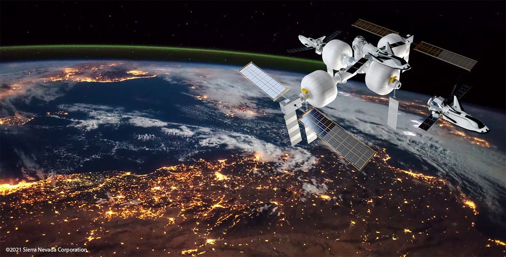 | One configuration of SNC’s modular LIFE-habitat-based commercial space station. |