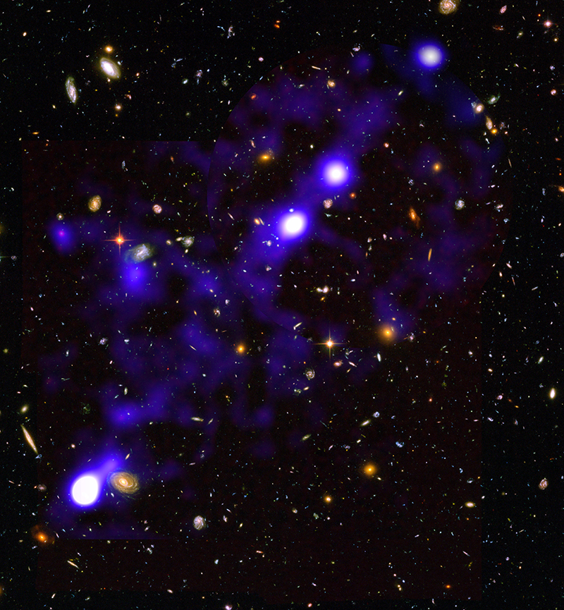 | A filament of glowing hydrogen imaged by the MUSE instrument on ESO’s Very Large Telescope in Chile and overlaid on the iconic Hubble Ultra-Deep Field. It is 11.5 billion light-years away and 15 million light-years long. |