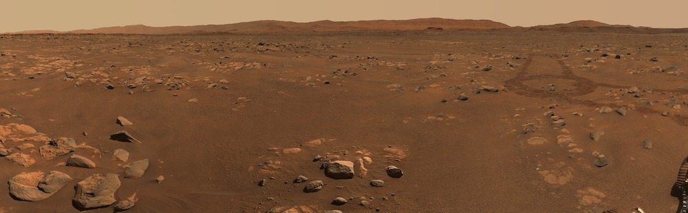 | Perseverance used its Mastcam-Z stereo imaging system to capture a 360-degree panorama while waiting for Ingenuity to complete its early flights. The resulting composite is comprised of 992 images and 2.4-billion-pixels. Can you find Ingenuity? (click for an interactive, zoomable version) | |