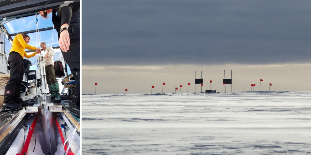 | Left: Christoph Welling’s photo of antennas being lowered 100 m below the surface of the ice at an RNO-G station. Right: Cosmin Deaconu’s photo of the first RNO-G station (everything but the solar panels is buried in the ice). |