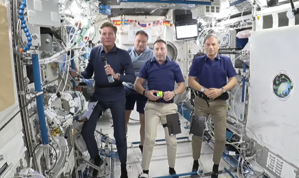 | The first all commercial crew on the ISS answering questions from Houston-area students. Left to right: Connor, López-Alegría, Pathy, and Stibbe. |