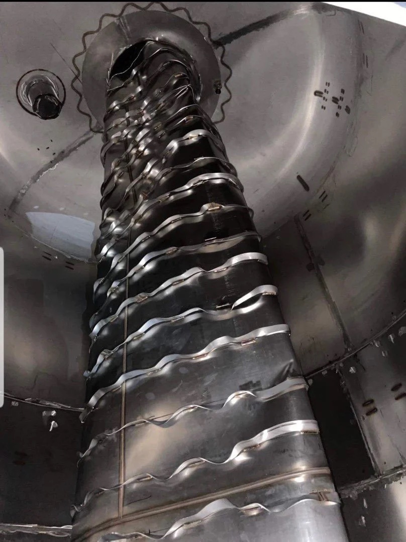 | A leaked photo of Booster 7’s damaged downcomer. The rings around it are likely either slosh baffles for the liquid oxygen in the lower tank or stiffening rings to keep the downcomer from rupturing when the methane tank is filled and pressurized. |