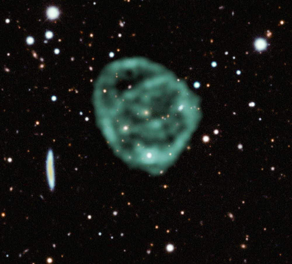 | Odd radio circles (ORCs) are rings in the radio spectrum much larger than galaxies. We only know about five of them, with the first detected in 2019. We also don’t know what causes them yet—shockwaves from merging black holes, active galactic nuclei, starbursts, or something equally energetic. MeerKAT has now imaged an ORC in unprecedented detail and it may be more than a million light-years across (10X the diameter of our galaxy). | |