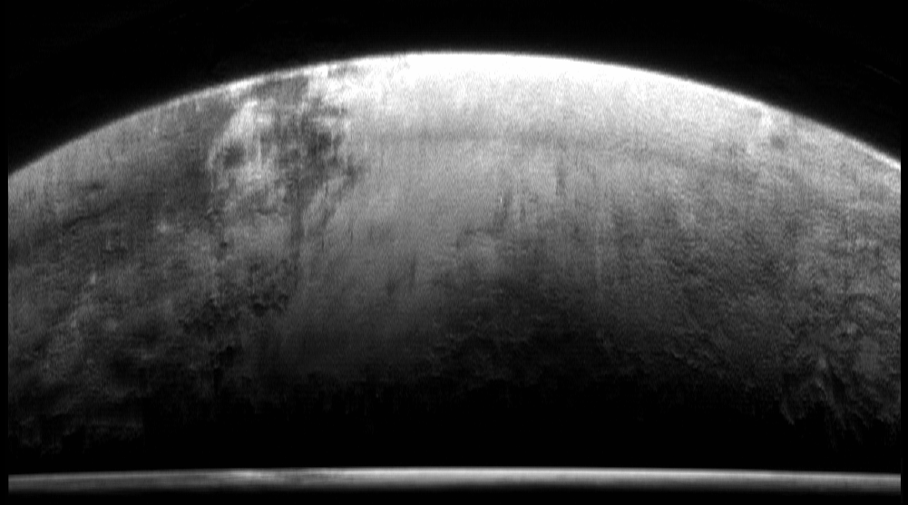| A little-known image of Pluto’s Southern Hemisphere, including part of Sputnik Planitia, a basin of frozen nitrogen. The image was captured by New Horizons’ MVIC imager which sweeps a 1-pixel band across its target as the spacecraft carefully slews, creating an image one line of pixels at a time. However, this image was experimentally captured by the NS team in reverse as the craft quickly “rewound” to take its next image and was later deconvolved and rectified (the original raw capture is the band at the bottom of the image). Credit: Tod Lauer |  |