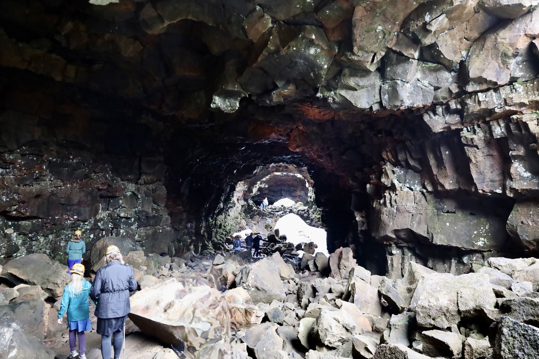 | The entrance to the Raufarhólshellir lava tube. Farther into the tube you can see snow drifts that have accumulated under two “lava pits” where the ceiling of the tube collapsed. Their existence in Icelandic summer demonstrates the temperature moderating potential of lunar lava pits. Credit: Ben |