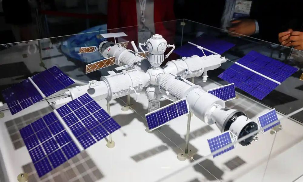 | | A model of the proposed, fully built Russian station, which would host two crews of up to four cosmonauts annually. |