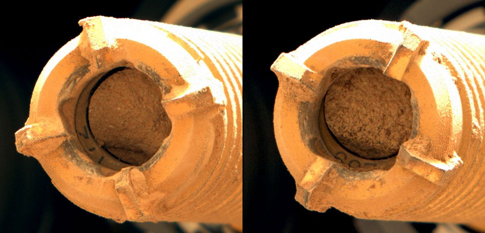 | | Two classroom-chalk-sized rock cores inside Perseverance’s drill were extracted on “Wildcat Ridge” in Jezero Crater. |