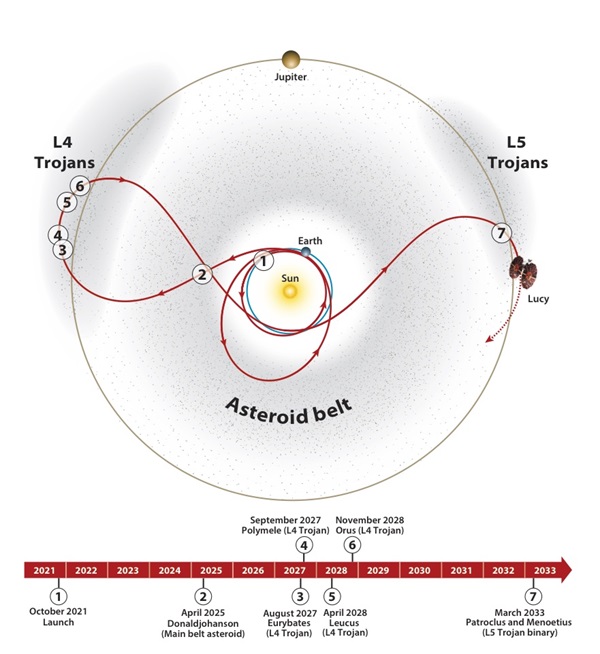 ¶Lucy swings by Earth. On October 16th, NASA’s Lucy spacecraft swung by Earth, just 350 km above the surface (lower than the ISS), stealing some kinetic energy from the planet on her way to the asteroid belt (to visit Donaldjohanson) and from there on to Jupiter’s Trojan asteroids. Trapped in Jupiter’s orbital circumference, but 60° out of phase in front of and behind the gas giant, the two groupings of Trojan asteroids have never been visited by humanity. After a year in space, Sunday’s gravity assist will help Lucy reach the first group of Trojans 5 years from now, but not before a second Earth assist three years into its journey. Flying past six L4 Trojan asteroids (Eurybates and its satellite Queta, Polymele and its yet unnamed satellite, Leucus, and Orus) trailing behind Jupiter, Lucy will then return to Earth for a third gravity assist in 2030 before heading off to the second group of L5 Trojans, 60° ahead of the gas giant. There she’ll visit the Patroclus-Menoetius binary asteroid pair. Because Sunday’s flyby was at such a low altitude, procedures were in place to perform debris avoidance maneuvers if conjunctions were detected, and atmospheric drag had to be factored in, forcing a slightly higher altitude than planned due to Lucy’s one partially unlatched solar array. Lucy also snapped photos of the Earth and Moon for funsies (and calibration) as she shot by. | |