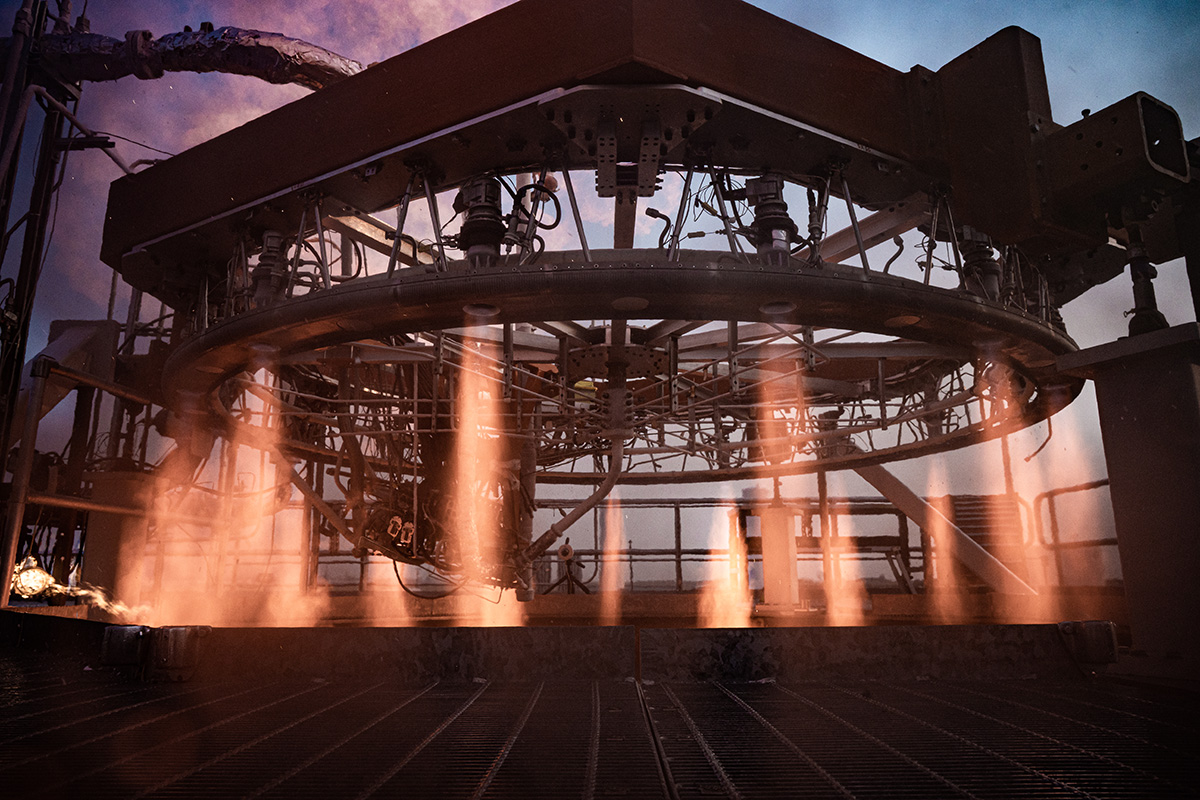 | | Stoke’s 30-nozzle hydrolox powerhead firing half of its thrusters during a test in September. |