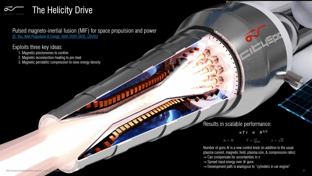 ¶The quest for a fusion drive. As evidenced by… roughly speaking… every sci-fi series, fusion engines are the future of space propulsion. California startup Helicity Space is on a mission to develop such a drive today. Their approach is basically a deuterium-deuterium plasma thruster with a pulsed magneto-inertial fusion “afterburner” that compresses confined plasmoids in a double-helical magnetic system (a “plectoneme”… kind of like a helical z-pinch). While early versions of the Helicity Drive wouldn’t exceed the Lawson criterion (more energy out than in) and would require external (presumably solar) power, the energy added to the exhaust from fusion would increase the system’s exhaust velocity and ISP (giving somewhere in the neighborhood of 10,000 s isp, vs a maximum of ~400 for chemical rockets). The claim—which we’re somewhat skeptical of—is that this energy gain is easier to achieve than a sustained, contained, terrestrial fusion power system (recent presentation from their chief scientist). The required techniques of helical plasma jets (paper), magnetic reconnection heating (paper), and peristaltic magnetic compression (paper) have been demonstrated in the lab at varying scales. Notably, their all-star science and strategy advisory board includes Pete Worden, Air Force General and later Director of NASA's Ames Research Center, and Alan Stern, PI of the New Horizons mission to Pluto—here is Alan excitedly pitching the company and a proposed mission which would reach the interstellar medium in about 10 years. While this may not be the company that ultimately builds a fusion engine (it could be competitor Princeton Satellite Systems, a magnetic mirror approach like Realta Fusion’s, or something else), it does feel like humanity will build one eventually, and we’re glad engineers are seriously working on it today. They’ve raised about $5M based on aggressive timelines, so hopefully, we’ll know more soon. |
