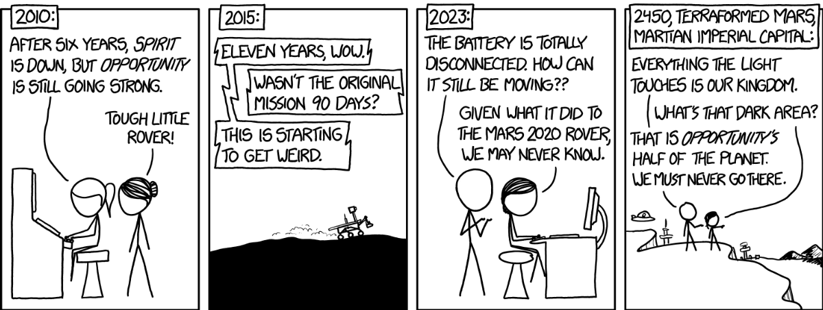 | | “We all remember those famous first words spoken by an astronaut on the surface of Mars: ‘That's one small step fo- HOLY SHIT LOOK OUT IT'S GOT SOME KIND OF DRILL! Get back to the ... [unintelligible] ... [signal lost]’” XKCD #1504 |
