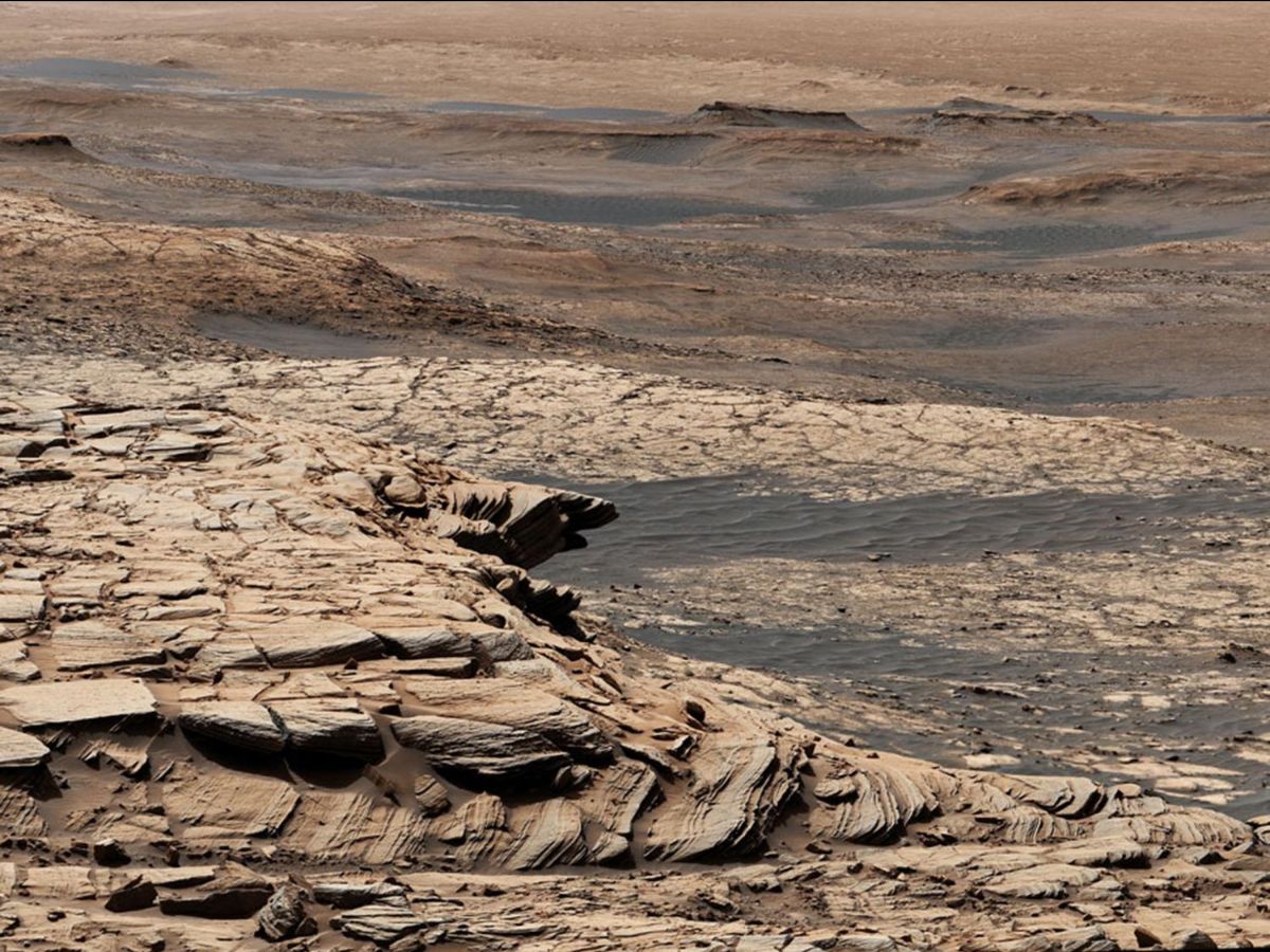 | The floor of Gale Crater is visible in the distance at the top of this image taken by Curiosity. Gale Crater is near a region called Aeolis Dorsa which may once have been a massive ocean. Credit: NASA/JPL-Caltech/MSSS. |