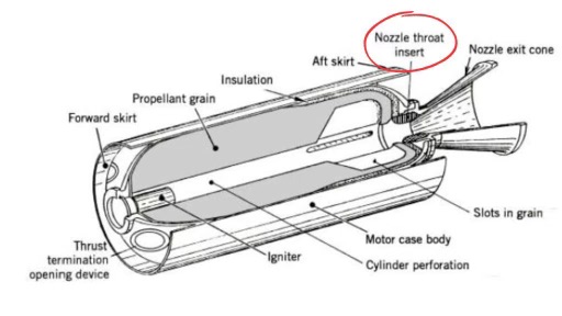 | A solid rocket’s nozzle throat insert is tasked with compressing and containing the combustion gasses and is the single highest stress component in this type of engine. |