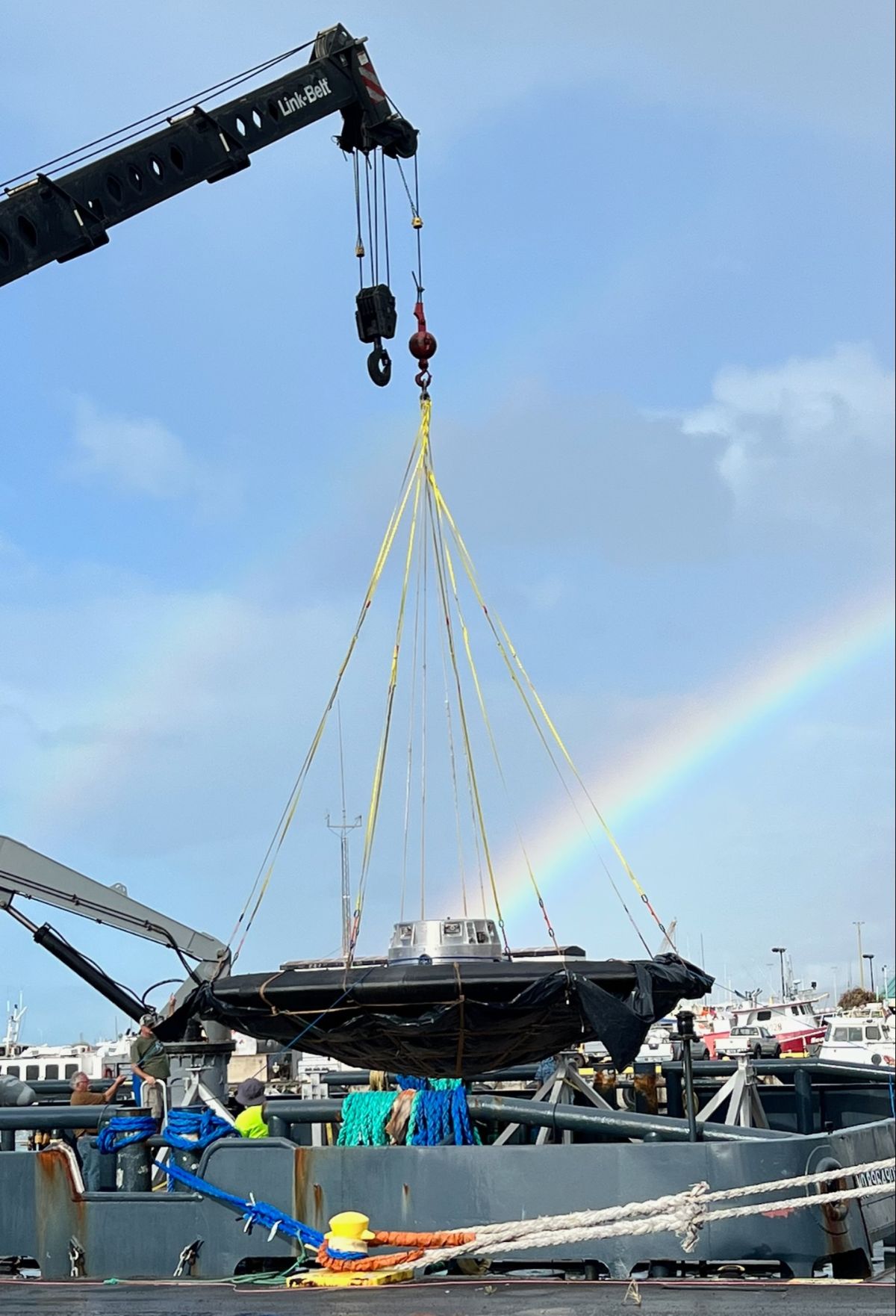 | | LOFTID, at port in Hawai’i after being fished out of the Pacific. |