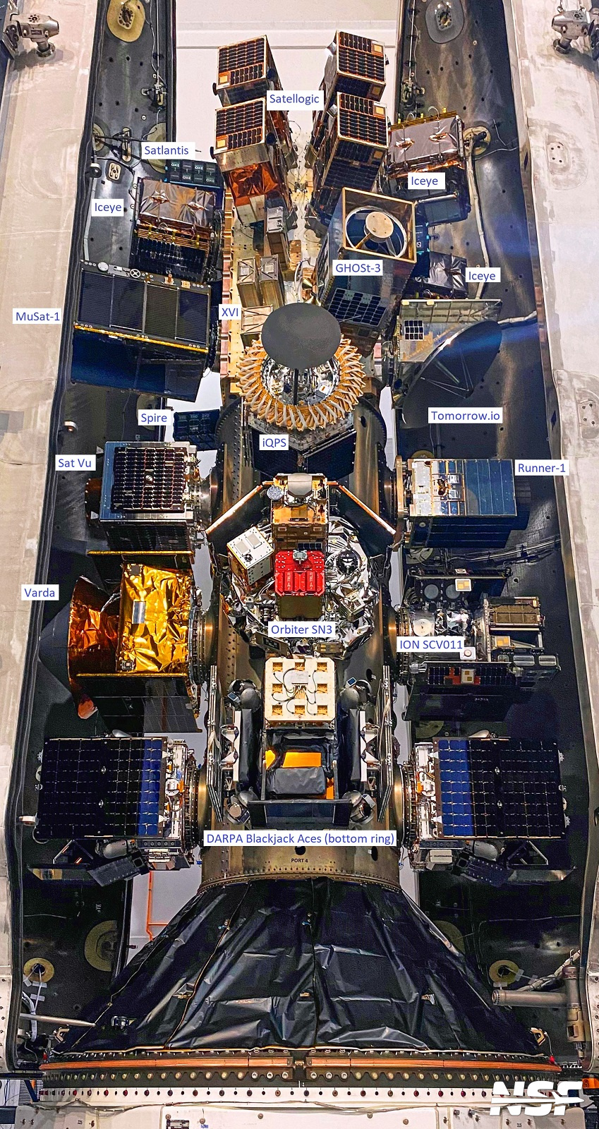 | Transporter 8 payloads pictured just before encapsulation in their payload fairings. Credit SpaceX, with annotations by NASA Spaceflight. |