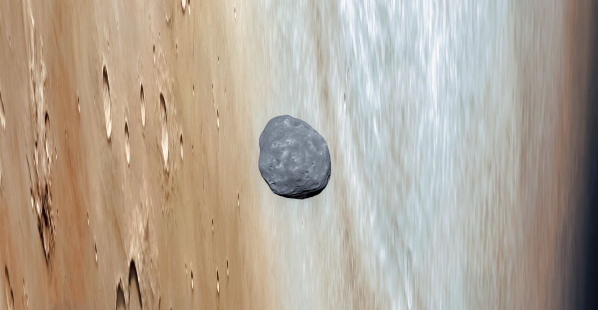 | A striking recent image taken by ESA Mars Express and processed by Andrea Luck shows Mars’s moon Phobos over the red planet. Credit: ESA/DLR/FUBerlin/AndreaLuck |