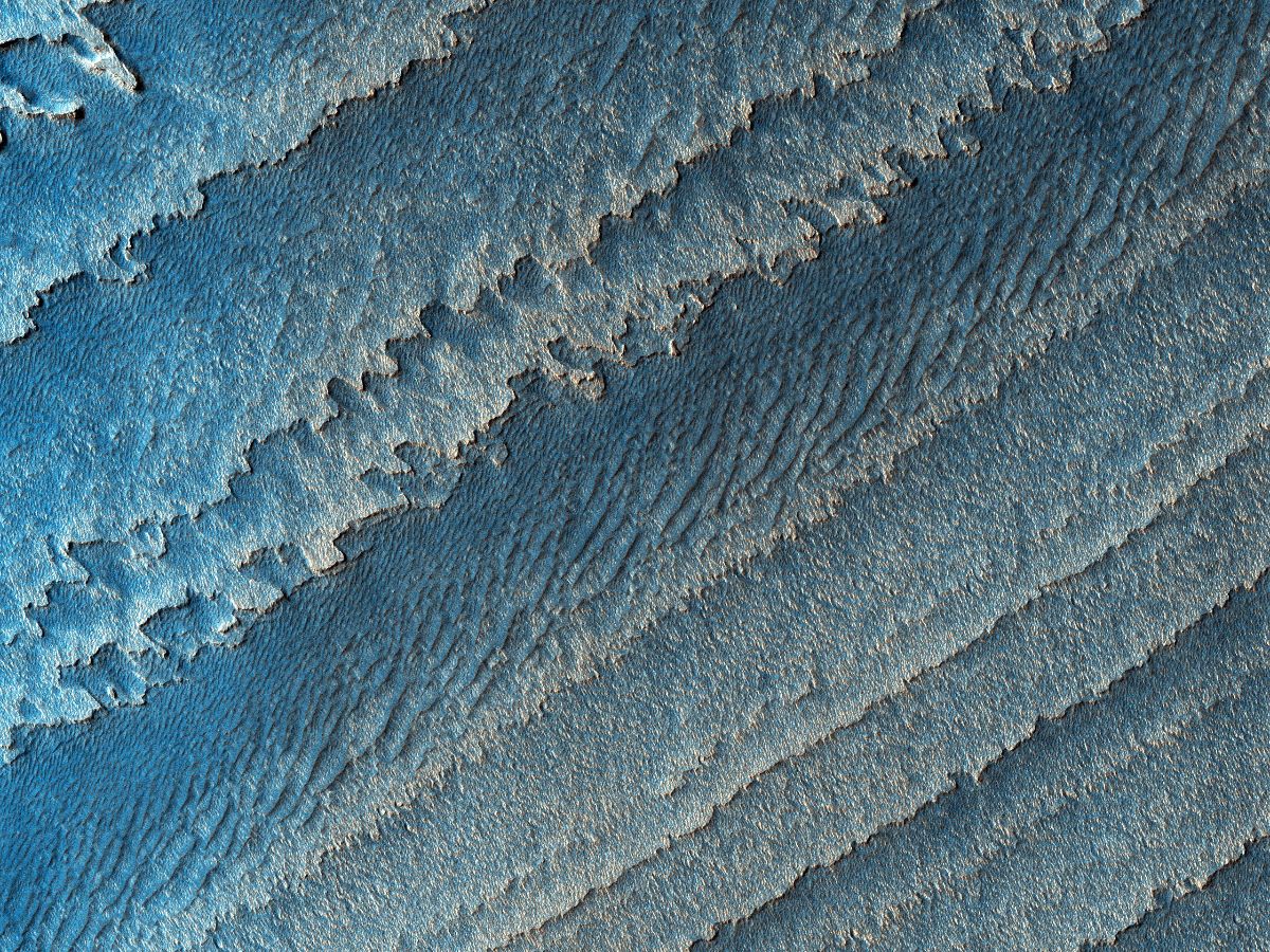 The Galle Crater deposit pictured below contains multiple unconformities (gaps in the geologic record represented by sudden or irregular changes from one deposit to another), indicating periods of erosion and non-deposition. The crater’s geologic history is not well constrained, and it contains a variety of features that have been interpreted as fluvial (river), lacustrine (lake), or glacial deposits. Credit: NASA/JPL-Caltech/UArizona | |