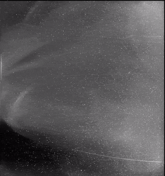| "Parker Solar Probe’s Wide Field Imagery for Solar Probe (WISPR) camera observes as the spacecraft passes through a massive coronal mass ejection on Sept. 5, 2022.” Credit: NASA/Johns Hopkins APL/Naval Research Lab |