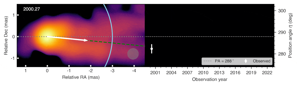 - We now have proof that the supermassive black hole at the center of galaxy M87, famously the source of the first image of a black hole from the Event Horizon Telescope, is spinning. Using two decades of data from more than 20 radio telescopes around the planet, the jet of material shooting out of M87 was shown to precess by about 10 degrees over a period of 11 years (paper), proving the blackhole’s spin.