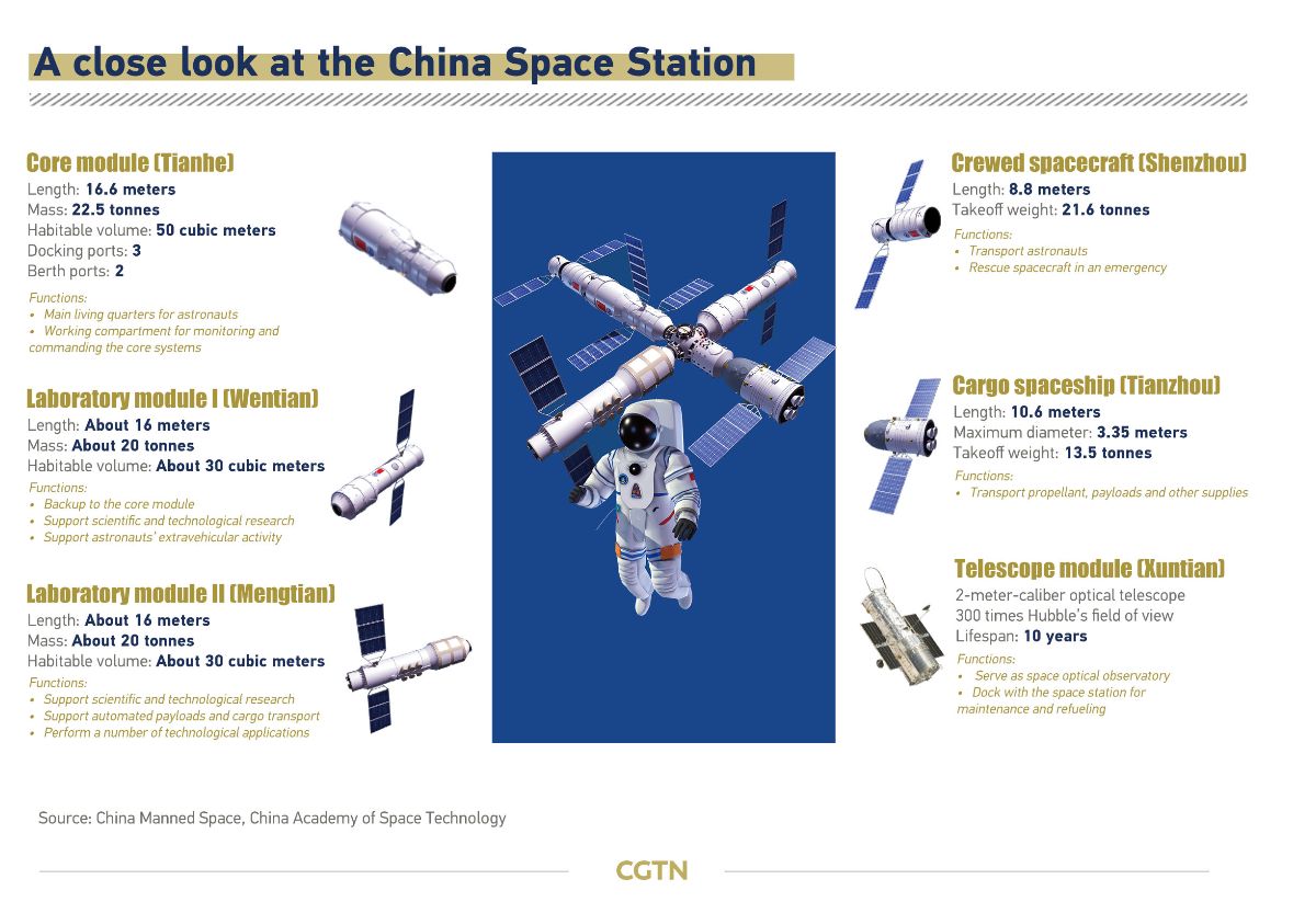 | Tiangong, the Chinese Space Station, and its related spacecraft - circa 2021. Credits: China Manned Space Agency, CAST, CGTN |