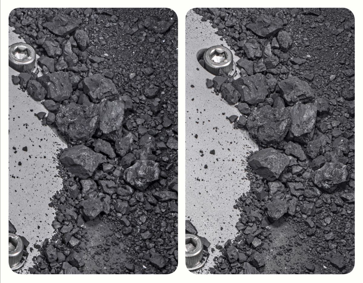| Stereoscopic images of material retrieved by OSIRIS-REx from Bennu, on top of the TAGSAM (Touch-and-Go Sample Acquisition Mechanism) instrument, which is currently held closed by the two most stubborn fasteners of its original 35. |