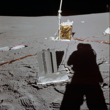 | Alan Shepard’s shadow next to the Apollo 14 SNAP-27 RTG, which powered the mission’s ALSEP surface experiments package, shown here wired to a central relay station that sent data to Earth. ALSEPs were part of all Apollo missions starting with Apollo 12 (November 1969), and all five were still actively transmitting when the program was canceled in September 1977. |