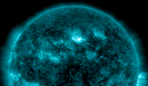 | Several of the recent solar X-class flares can be seen at the top right of this extreme ultraviolet spectrum video of our star captured by NASA’s Solar Dynamics Observatory. Credit: NASA. |