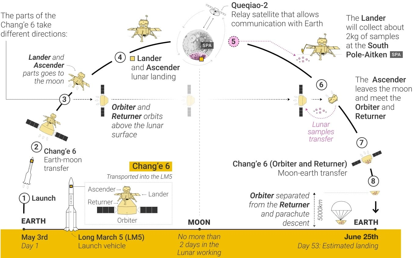 ¶Chang'e 6 lands on the Moon, then launches again. The first lunar far-side sample return mission, China’s Chang'e 6, autonomously landed in the Moon’s vast far side South Pole-Aitken impact basin this weekend (landing video), collected samples, and has already launched them into lunar orbit. China is now four for four on Moon landings. The lander autonomously selected a landing site, descended to 100 m, and then hovered for a LIDAR scan before descending and cutting the engine just before touchdown, with the final shock absorbed by cushioning landing legs. Interestingly, "to prevent interference to optical sensors by lunar dust during landing, the lander is also equipped with gamma-ray sensors to accurately measure [its distance]" above the surface. Landing was timed with the Sun rising over the Moon’s largest, deepest, and oldest (known) crater so that the mission could operate during the lunar day. This is a region of ancient mare basalts likely composed of mantle material which are geologically distinct from the Moon’s near side. The mission launched on May 3rd on a heavy-lift Long March 5 from the Wenchang Satellite Launch Center. The ambitious mission will deliver 2 kilograms of pristine lunar far side material, both drilled from a depth of up to 2 meters and collected on the surface with a robotic arm, to Earth. It is composed of an orbiter, a lunar lander, and an ascent vehicle, now back in lunar orbit with samples, which will soon dock with the orbiter and transfer its cargo to a reentry capsule. The lander also carried a surprise, unannounced rover with an infrared spectrometer. Due to landing on the side of the Moon perpetually facing away from Earth, the mission relies on the recently launched Queqiao-2 relay satellite (itself a research spacecraft, c.f. Issue 260). This complex architecture builds on Chang'e 4, which in 2019, was humanity’s first soft landing on the lunar far side (and also delivered the Yutu-2 rover), and 2020’s Chang'e 5, a successful robotic lunar sample return (for which CE6 was initially backup hardware). In addition to the sampling drill and scoop, onboard is a ground-penetrating radar and a mineral spectrometer. China has been trying to encourage international science collaboration, so it also carries a radon-detecting payload from France, a Swiss surface ion research payload, an Italian passive laser retro-reflector, and the already-deployed-and-functioning 7 kg cubesat from Pakistan with onboard cameras and a magnetometer (here are its first lunar photos). If all goes well, lunar geologists will have a field day with CE6’s samples once they land in Inner Mongolia near the end of June. | |