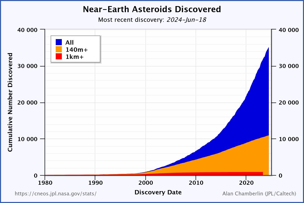 | A graph of NEAs discovered over time. With >90% of the 1 km+ objects found, NASA has now turned its attention to making sure it finds >90% of 140 m+ asteroids. The most recent NEA was discovered on June 18th. |