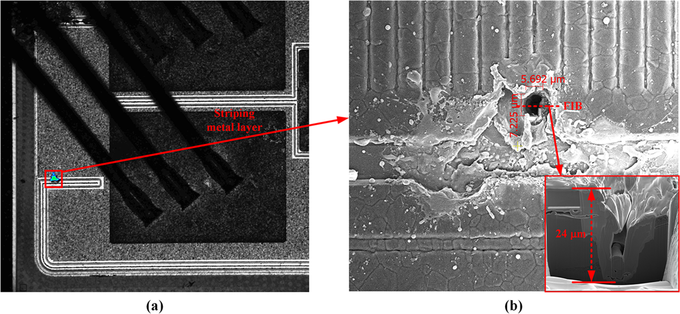 | A scanning electron microscope view of MOSFET damage after exposure to Ta ion irradiation. |