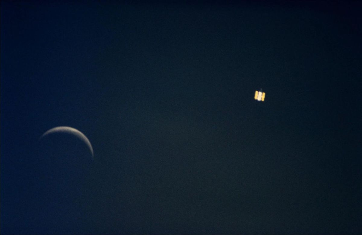 Hubble in front of the Moon from the perspective of Space Shuttle Endeavor during the first Hubble servicing mission in 1993. | |