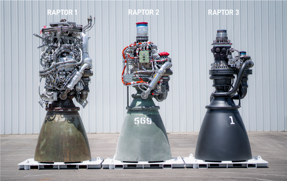 A side-by-side comparison of the three generations of SpaceX Raptor sealevel engines, highlighting the refined design of Raptor 3. Credit: SpaceX | |