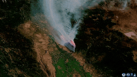 | The Park fire burning in northern California and very visible from space. |