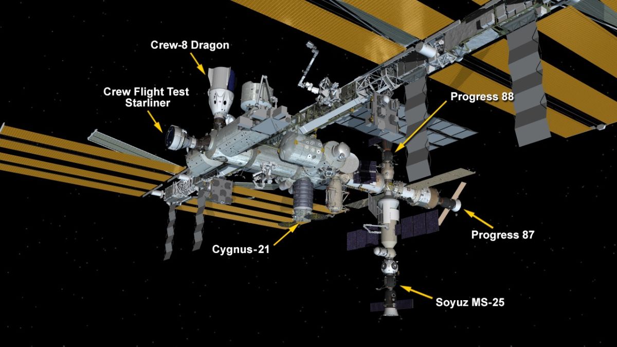 | Six vehicles, including Starliner, were docked (or berthed) with the ISS on August 6th. Credit: NASA |