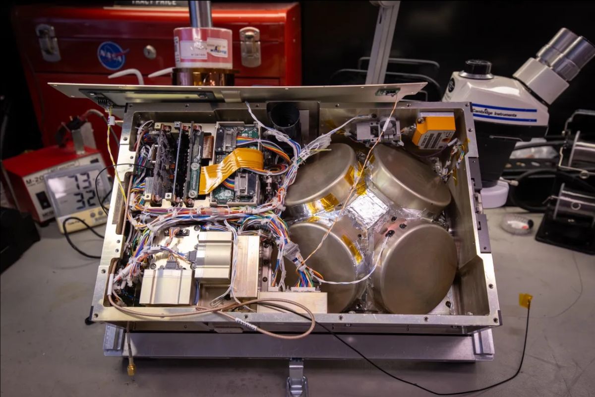 | BurstCube with its lid off; its detection instrument, consisting of cesium iodide scintillators and photomultipliers, is on the right. Credit: NASA |