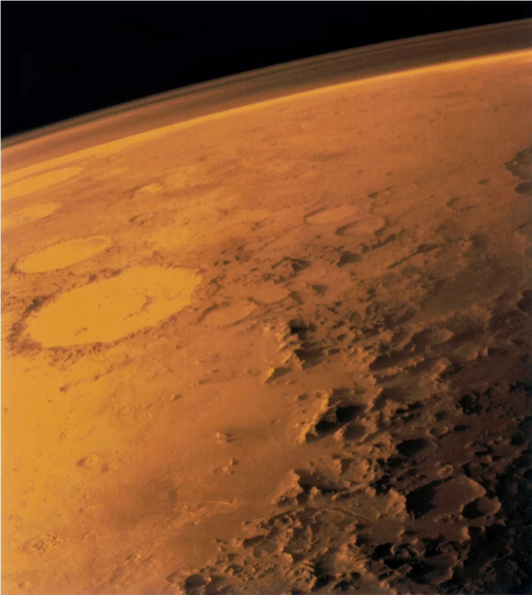 A striking image of Mars taken by Viking 1 in June 1976 shows the tenuous Martian atmosphere and side-lit terrain. | |
