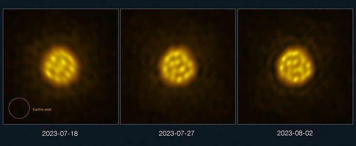 - ESO’s ALMA captured images of gas bubbles on the surface of massive star R Doradus, a first for a star other than our Sun (paper). The hot bubbles are each 75x the width of the Sun. nbd.