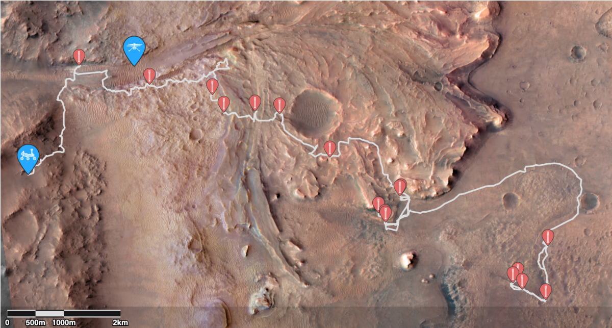 ¶Percy labors toward the rim. Recent weeks have seen the 3 ½-year-old rover slowly making its way up to the rim of Jezero Crater, with the goal of cresting in early December and taking its first peek outside the crater. Driving over loose dust and sand that has a brittle crust has led to increased wheel slippage. This slippery terrain has reduced daily drive distances by 50% or more, with one day only clocking the rover at 20% of its planned distance. (Percy can drive at a top speed of 160 meters/hour and up to ~300 meters per day.) The rover driving team has tried several mitigation techniques, including driving backward (the video here reminds us of how Model Ts had to drive in reserve up hills due to not having a fuel pump), using switchbacks, and driving on the northern edge of the route. This last strategy improved traction the most, possibly due to more and larger subsurface rocks toward the northern geography. Along the way, Percy snapped a panorama that NASA annotated with many of the rover’s locations over the past three years, including its landing site that is now 8.7 km distant (here’s a bird's-eye view animation of the journey). The mission has been caching samples as it goes, although how those samples might be retrieved is still very much up in the air due to all the uncertainty around Mars Sample Return. To date, it has gathered and filled 24 of its sample tubes, taken an atmospheric sample in one more, and used three of its witness tubes. The rover launched with 43 tubes, and, with two witness tubes remaining and two tubes that the team has decided are off limits due to the possibility of the sample arm snagging its wiring harness while retrieving them, there are 11 tubes left to be filled and cached. Related: Perseverance also recently captured a high-resolution video of Phobos’ ~30-second transit of the Sun, which it does daily due to its near-equatorial, 7.6-hour orbit. | |