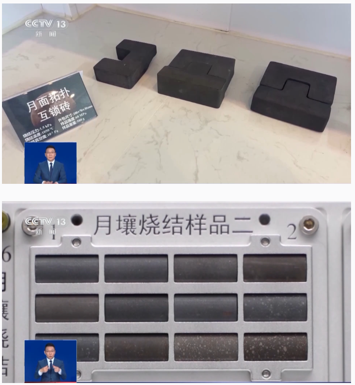 | The bricks shown here are made of lunar regolith simulant (aka not real lunar soil) and were launched aboard Tianzhou-8 to be placed outside the Tiangong station for ~3 years to study how they behave in the space environment. |