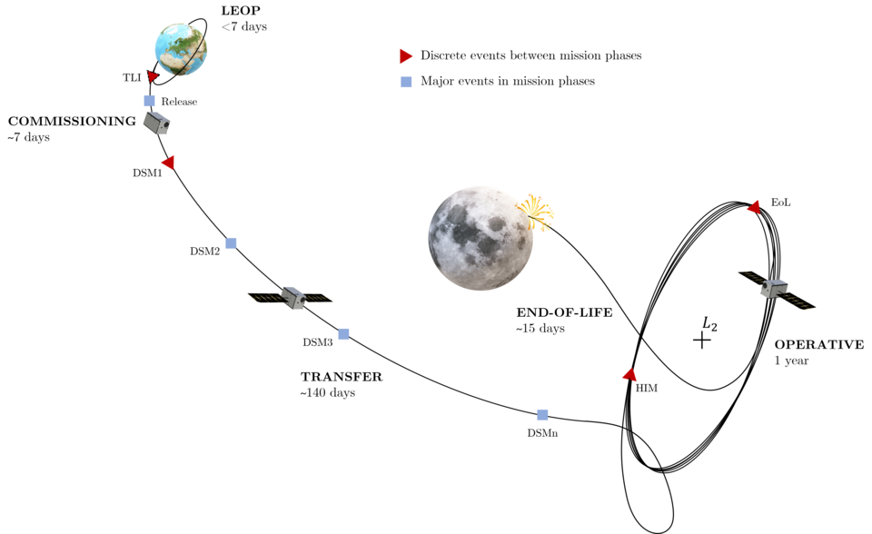 ¶ESA’s LUMIO. A CubeSat mission designed to observe flashes of light from meteoroid strikes on the Moon’s farside was approved by ESA last summer. After it launches NET 2027, Lunar Meteoroid Impacts Observer (LUMIO) should help us to better determine the meteoroid flux and its distribution in cislunar space, useful for both scientific models and to estimate how quickly space infrastructure will degrade due to impacts. LUMIO will use a lunar halo orbit, which allows it to see both the lunar farside and the Earth at all times, enabling real-time monitoring. | |