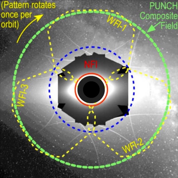 | PUNCH’s trefoil imaging pattern, near field imager, and composite field. The mission’s website is really quite informative and worth a look. |