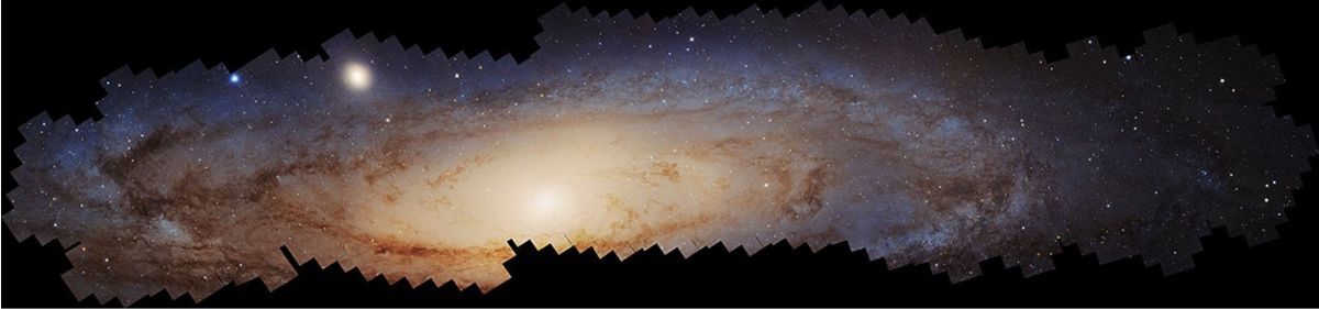 | Hubble’s largest photomosaic to date, a 2.5 billion pixel panoramic view of the Andromeda galaxy, uses 10 years of data and over 600 overlapping photos. Andromeda’s angular size is six times the diameter of the Moon, requiring a lot of snapshots with Hubble’s tight field of view. Here’s a direct link to the 9MB and 203MB (!!) versions. | |