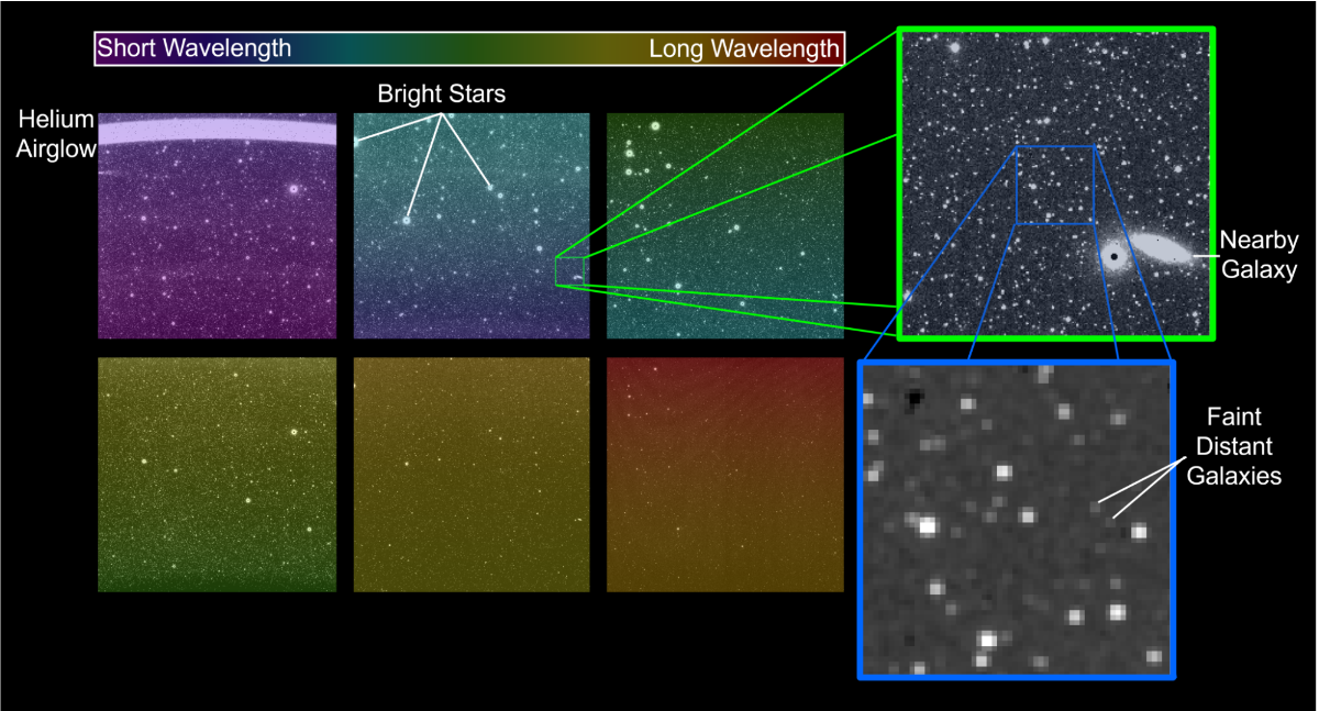 | Uncalibrated first images from all six sensors aboard NASA’s SPHEREx mission, with each exposure representing 100,000 light sources. |
