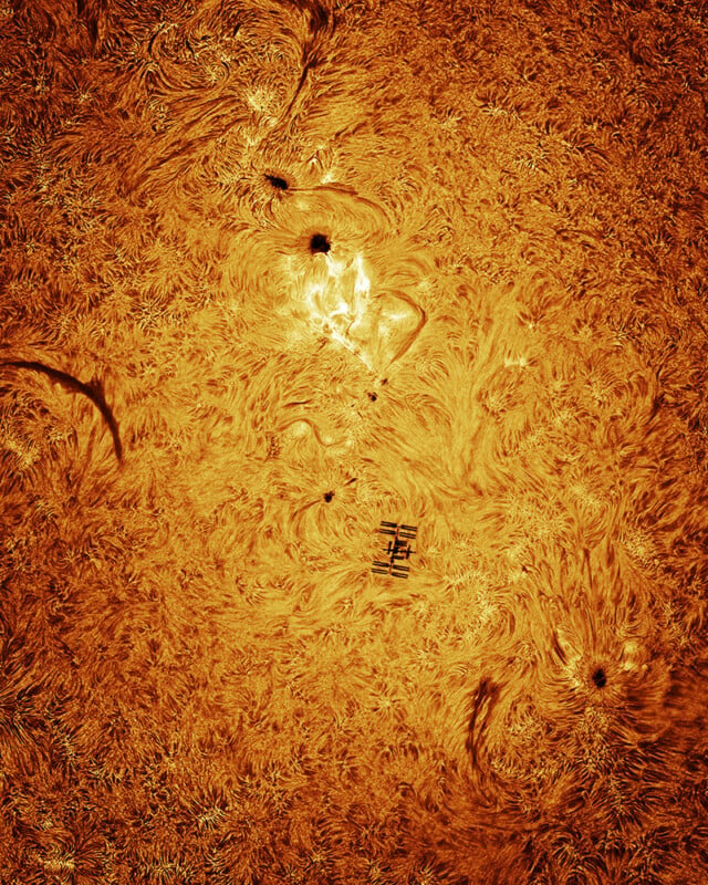 Astrophotographer Andrew McCarthy caught the ISS crossing in front of an emerging solar flare on June 15th in this stunning photo. Photo credit: Andrew McCarthy | |