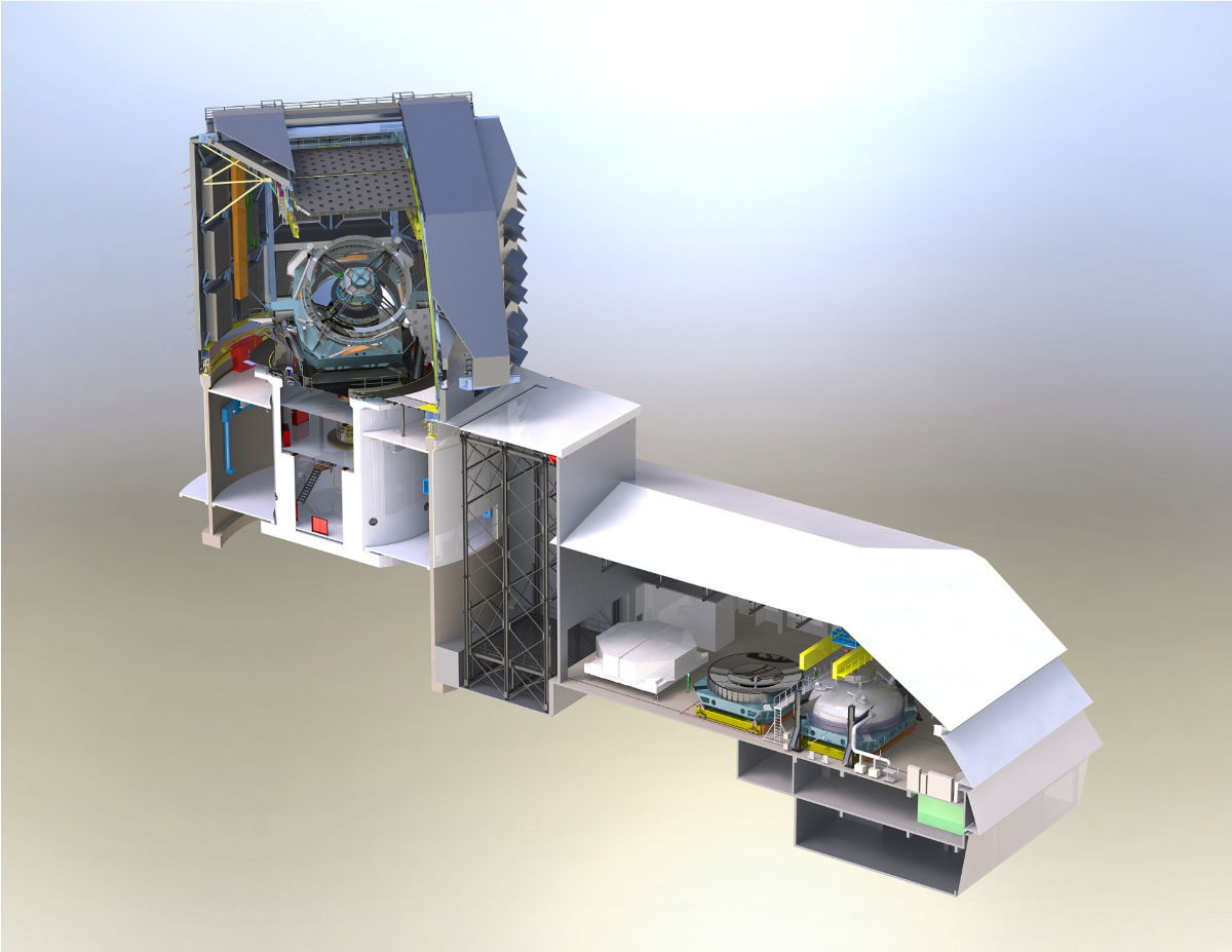 | A render of the Vera C. Rubin Observatory’s telescope, dome, and support building. The camera alone weighs three tons. |