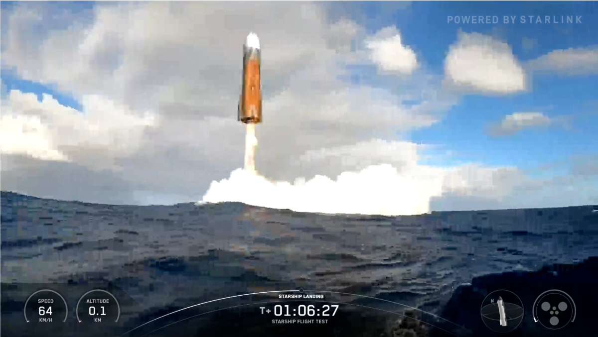 | Starship hovering above the Indian Ocean, red-tinged from some as-of-yet unknown torture to the craft’s heat shield during re-entry. Credit: SpaceX |