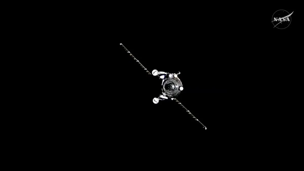 | Russia’s Progress 93 spacecraft, approaching the ISS ahead of docking, marking the 300th launch of an assembly, crew, or cargo mission to the ISS since 1998. |