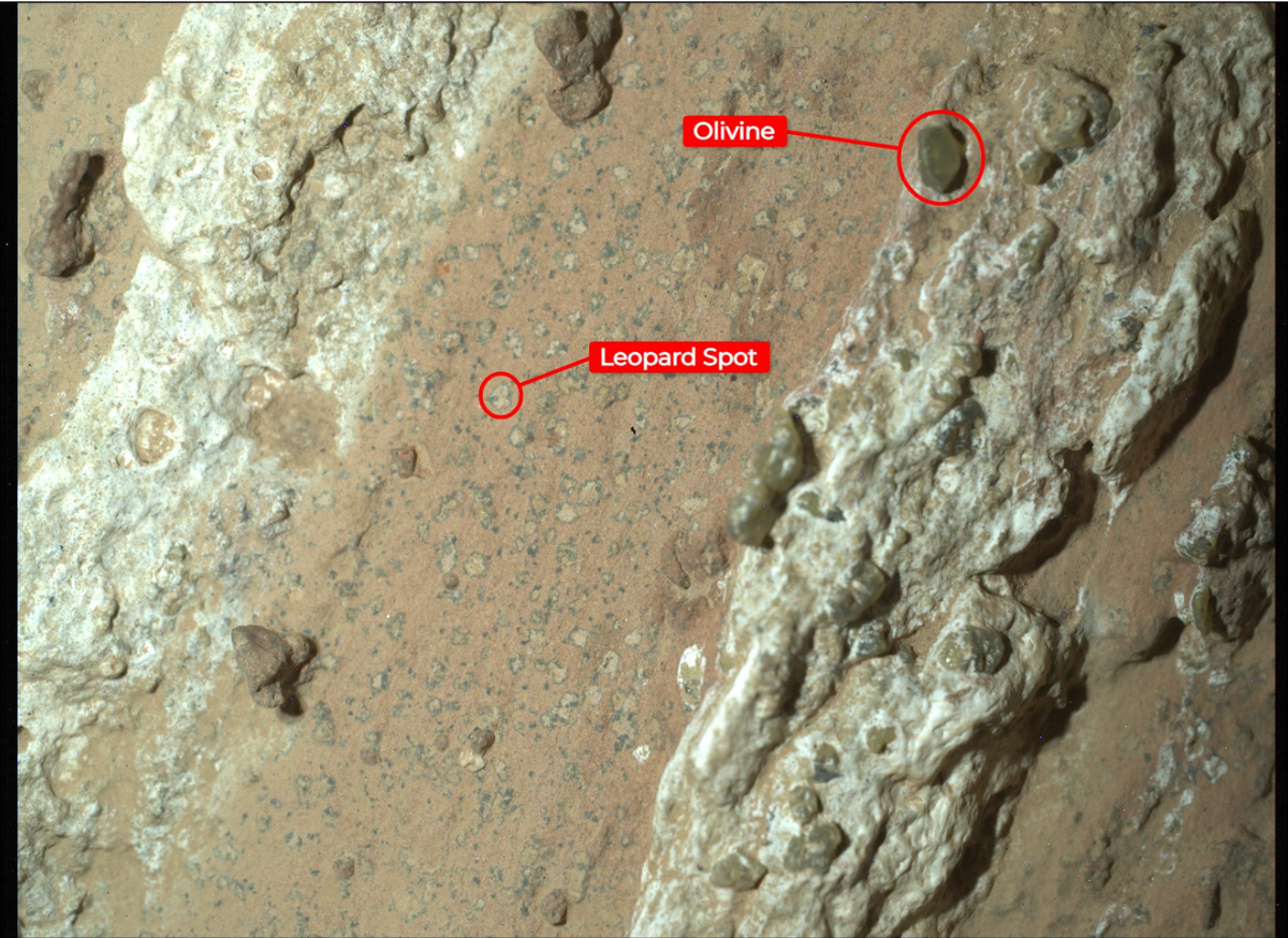 | ‘Leopard spots’ with dark-toned rims and lighter-toned cores in sedimentary rocks rich in organic carbon, sulfur, rust, and phosphorus, on Mars. Credit: NASA |